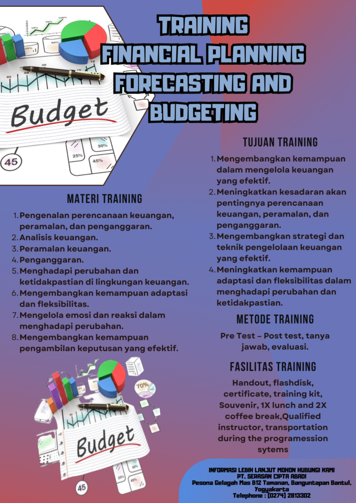 Training Financial Planning, Forecasting, and Budgeting adalah sebuah program pelatihan yang dirancang untuk membantu individu memahami dan mengelola perencanaan keuangan, peramalan, dan penganggaran. Dalam training ini, peserta akan belajar bagaimana mengembangkan rencana keuangan yang efektif, melakukan peramalan keuangan yang akurat, dan mengelola penganggaran yang efisien. Mereka akan mempelajari metode dan teknik pengelolaan keuangan yang efektif, termasuk analisis keuangan, peramalan keuangan, dan penganggaran. Training ini juga akan membahas tentang bagaimana menghadapi perubahan dan ketidakpastian di lingkungan keuangan, serta bagaimana mengembangkan kemampuan adaptasi dan fleksibilitas. Peserta akan belajar bagaimana mengelola emosi dan reaksi mereka dalam menghadapi perubahan, serta bagaimana mengembangkan kemampuan pengambilan keputusan yang efektif. Dengan demikian, training ini dapat membantu individu mengembangkan kemampuan dalam mengelola keuangan yang efektif, sehingga mereka dapat menjadi lebih produktif, efektif, dan sukses dalam lingkungan kerja yang dinamis dan tidak pasti.