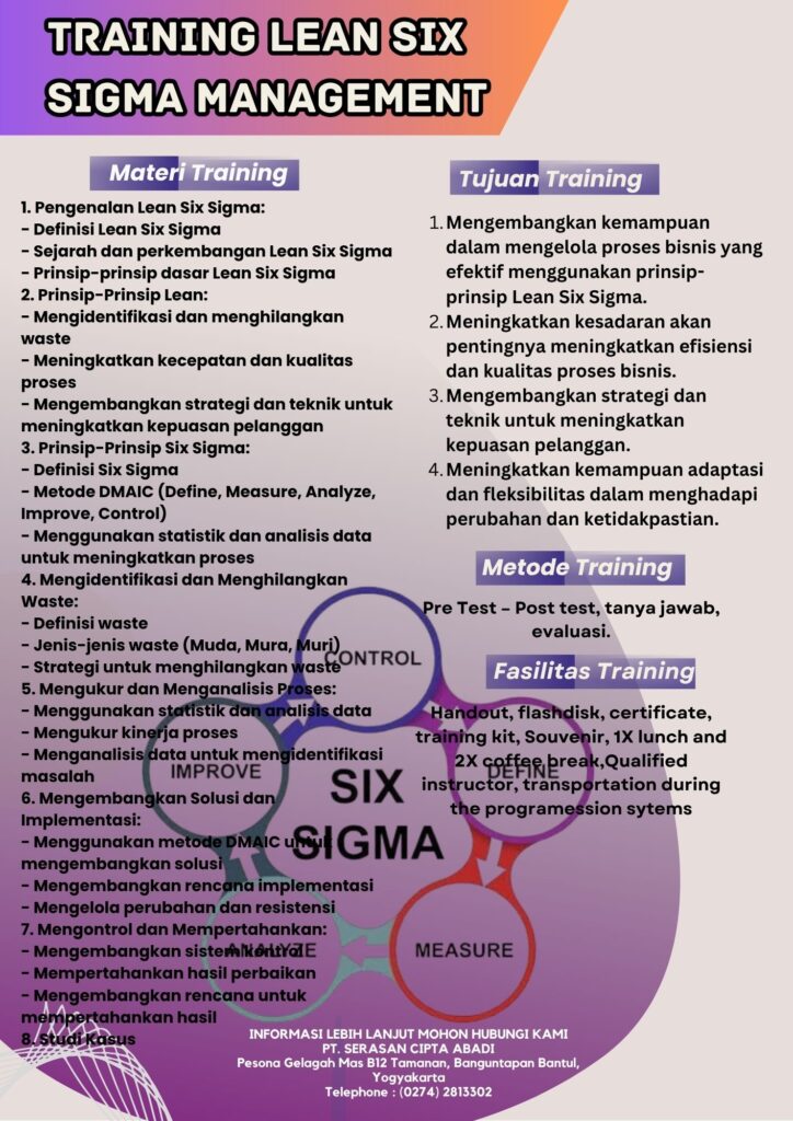 Training Lean Six Sigma Management adalah sebuah program pelatihan yang dirancang untuk membantu individu memahami dan mengelola prinsip-prinsip Lean Six Sigma dalam meningkatkan efisiensi dan kualitas proses bisnis. Dalam training ini, peserta akan belajar bagaimana mengaplikasikan prinsip-prinsip Lean Six Sigma dalam meningkatkan efisiensi dan kualitas proses bisnis, termasuk mengidentifikasi dan menghilangkan waste, meningkatkan kecepatan dan kualitas proses, serta mengembangkan strategi dan teknik untuk meningkatkan kepuasan pelanggan.