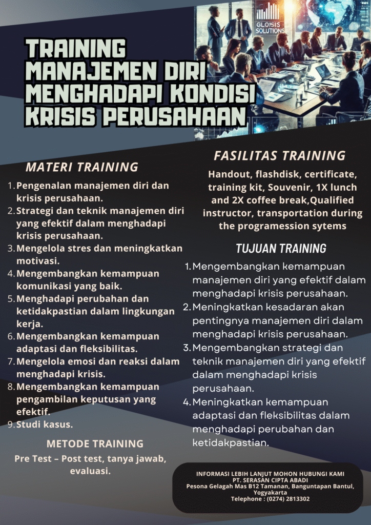 Training Manajemen Diri Menghadapi Kondisi Krisis Perusahaan adalah sebuah program pelatihan yang dirancang untuk membantu individu mengembangkan kemampuan manajemen diri yang efektif dalam menghadapi krisis perusahaan. Krisis perusahaan dapat terjadi dalam berbagai bentuk, seperti penurunan kinerja, perubahan pasar, atau krisis keuangan. Dalam training ini, peserta akan belajar bagaimana mengelola diri sendiri dan tim dalam menghadapi krisis perusahaan. Mereka akan mempelajari strategi dan teknik manajemen diri yang efektif, seperti mengelola stres, meningkatkan motivasi, dan mengembangkan kemampuan komunikasi yang baik. Training ini juga akan membahas tentang bagaimana menghadapi perubahan dan ketidakpastian dalam lingkungan kerja, serta bagaimana mengembangkan kemampuan adaptasi dan fleksibilitas. Peserta akan belajar bagaimana mengelola emosi dan reaksi mereka dalam menghadapi krisis, serta bagaimana mengembangkan kemampuan pengambilan keputusan yang efektif. Dengan demikian, training ini dapat membantu individu mengembangkan kemampuan manajemen diri yang efektif dalam menghadapi krisis perusahaan, sehingga mereka dapat menjadi lebih produktif, efektif, dan sukses dalam lingkungan kerja yang dinamis dan tidak pasti.