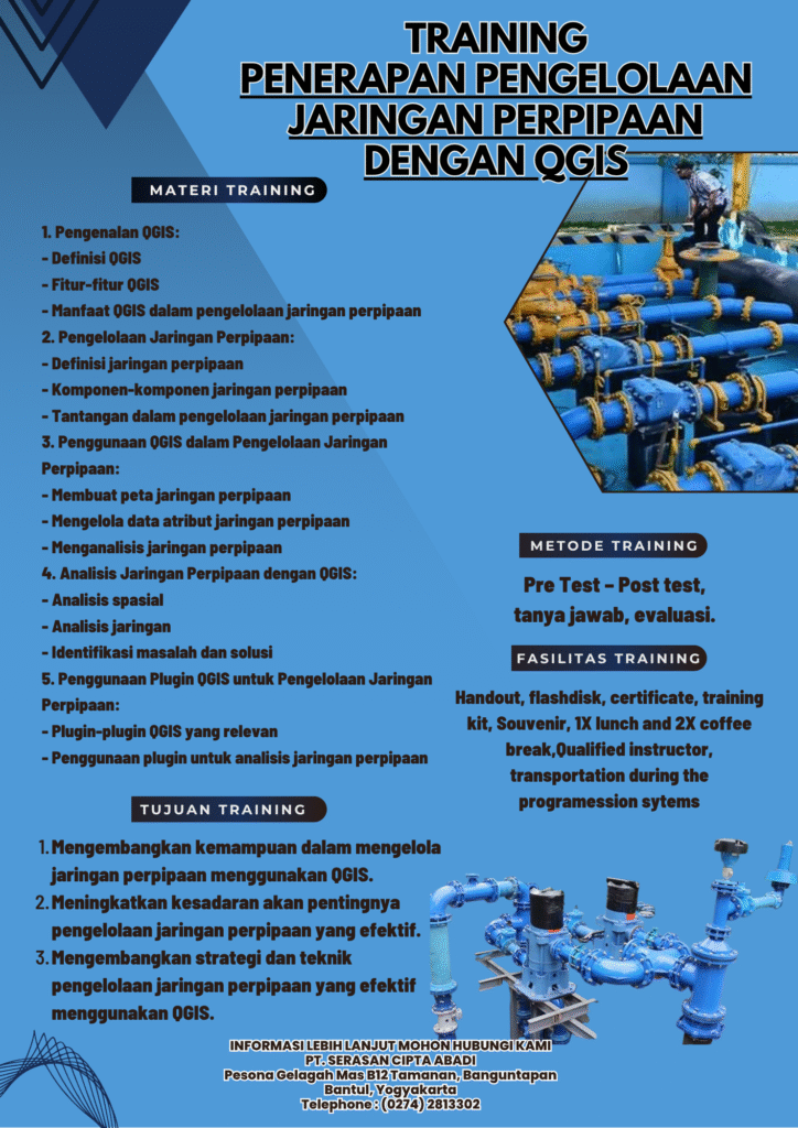Penerapan Pengelolaan Jaringan Perpipaan dengan QGIS adalah sebuah program pelatihan yang dirancang untuk membantu individu mengembangkan kemampuan dalam mengelola jaringan perpipaan menggunakan perangkat lunak QGIS (Quantum Geographic Information System).