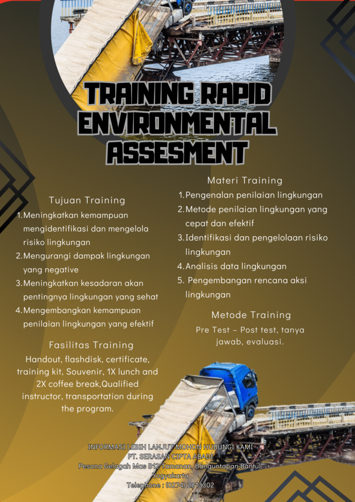Training yang dirancang untuk membantu individu memahami dan melakukan penilaian lingkungan yang cepat dan efektif. Pelatihan ini bertujuan untuk meningkatkan kemampuan penilaian lingkungan, serta mengembangkan strategi dan teknik untuk mengidentifikasi dan mengelola risiko lingkungan.