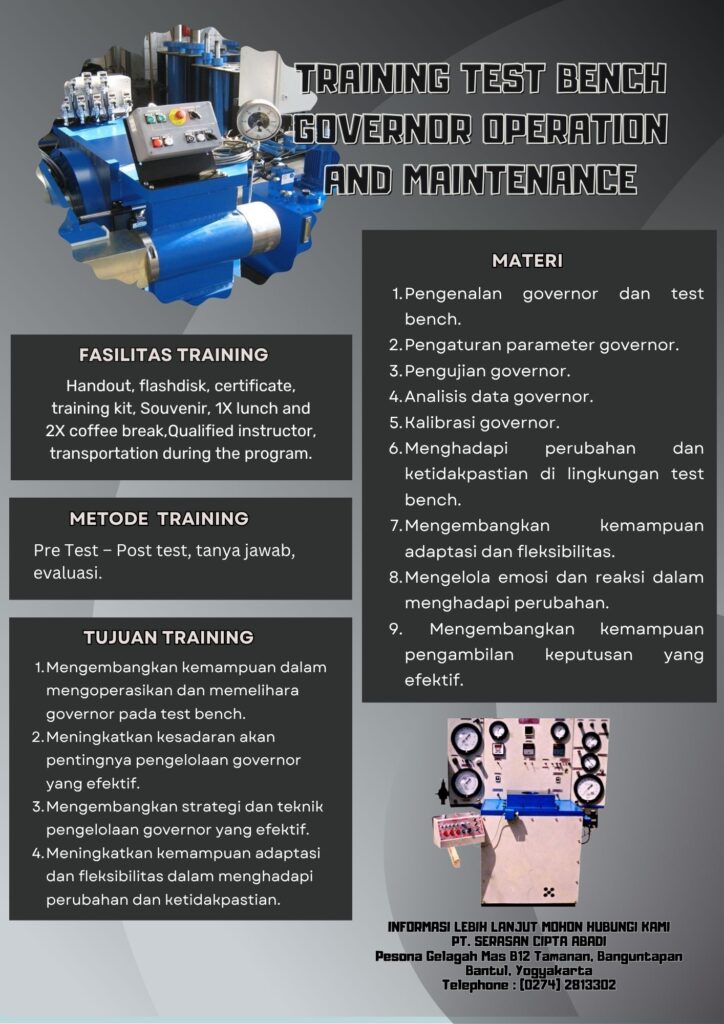 Training Test Bench Governor Operation and Maintenance adalah sebuah program pelatihan yang dirancang untuk membantu individu memahami dan mengelola operasi dan pemeliharaan governor pada test bench.