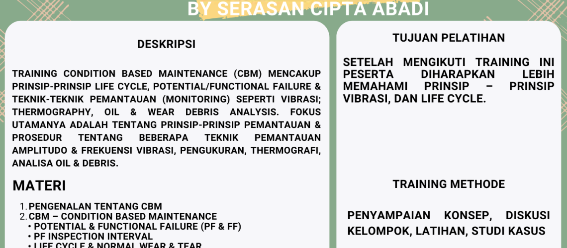 Training Condition Based Maintenance (CBM) mencakup prinsip-prinsip Life Cycle, Potential/Functional Failure & Teknik-teknik Pemantauan (Monitoring) seperti Vibrasi; Thermography, Oil & Wear Debris Analysis. Fokus utamanya adalah tentang prinsip-prinsip pemantauan & prosedur tentang beberapa Teknik Pemantauan Amplitudo & Frekuensi Vibrasi, Pengukuran, Thermografi, Analisa Oil & Debris.